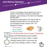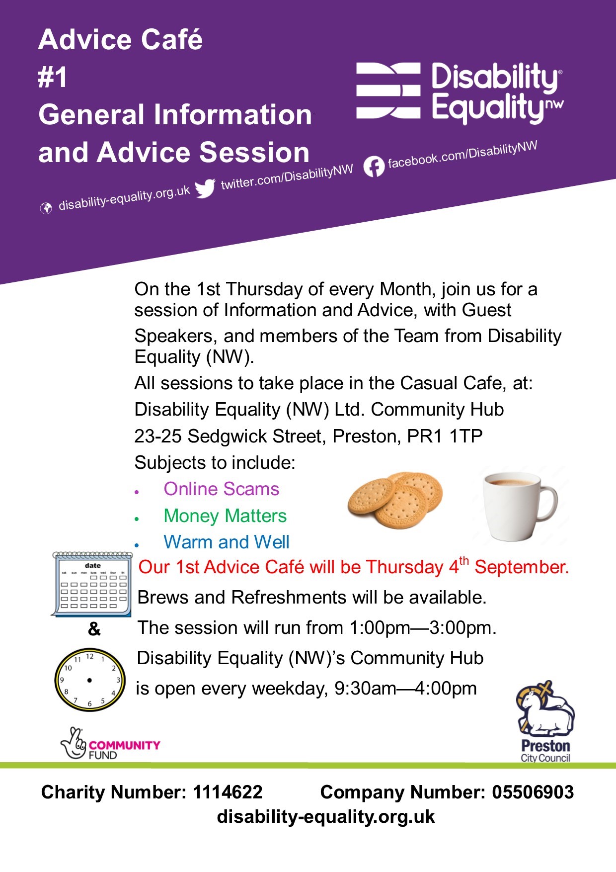 In the coming months, due to the clear need for advice led by lived experience, a series of Advice Café sessions will begin, hosted by Guest Speakers, and Disability Equality (NW) representatives. Stay tuned for more details – included in this and future bulletins, about upcoming Advice Café sessions at the Community Hub!
