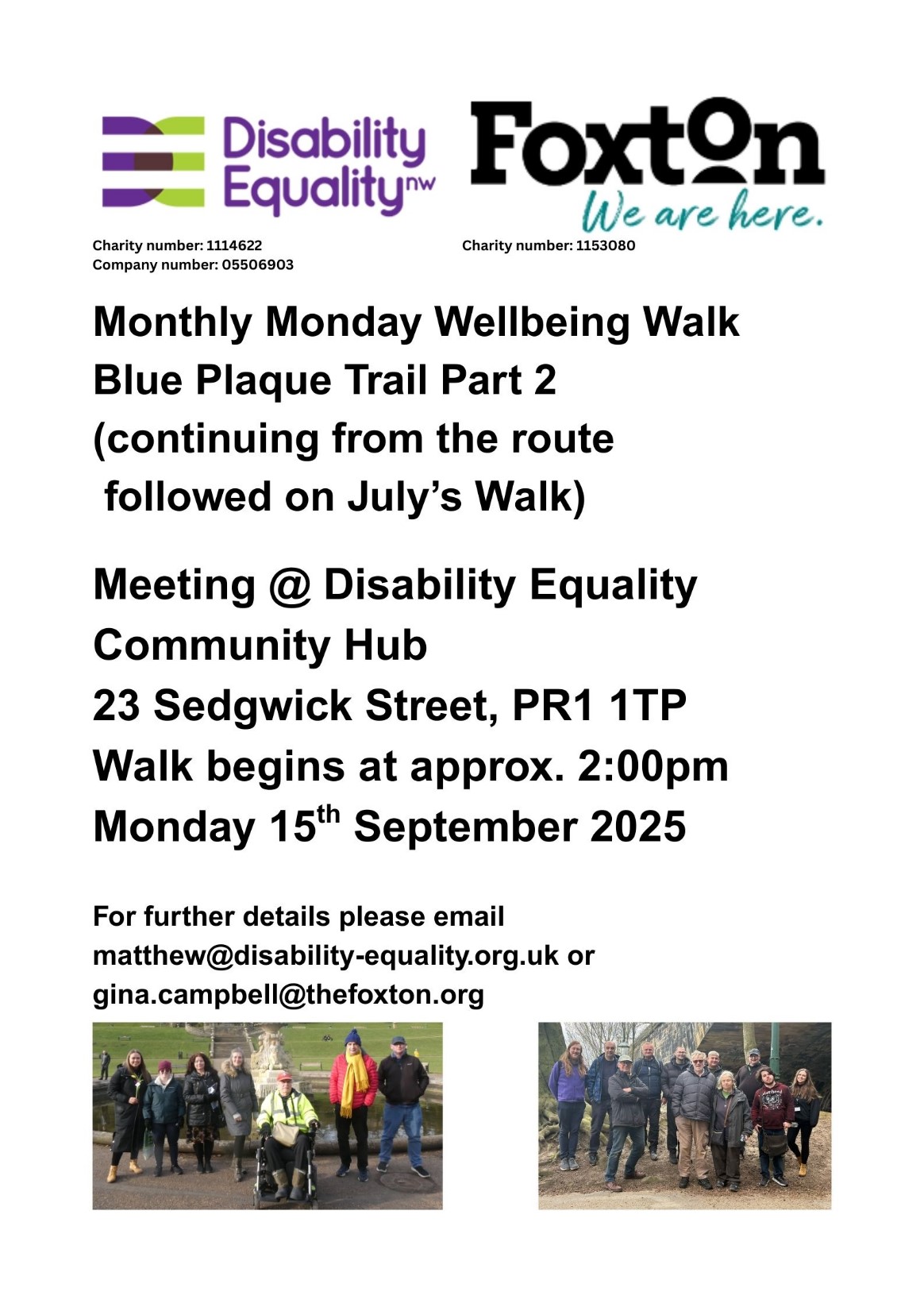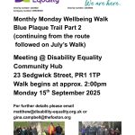 We had a very well attended Monthly Monday Wellbeing Walk in July, where attendees from across communities in-and-beyond Preston went on an intersectional walk learning about the Blue Plaques and newly-established Red Plaque, in Preston. Due to user-led demand, a Part 2 of this walk will follow, to complete, or at least continue, this much-requested Blue Plaque Trail of Preston to take part in September! Please see our publicity re: this month’s walk, on 15/9/2025, meeting at the Disability Equality (NW) Community Hub at 2pm.