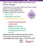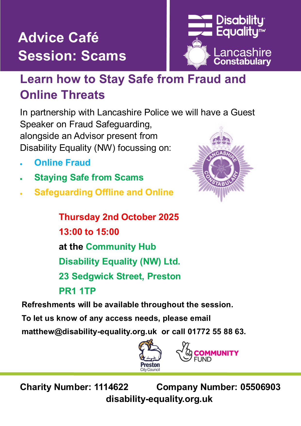 In partnership with Lancashire Police, we will have a Guest Speaker on Fraud Safeguarding, alongside a Disability Equality North West Advisor present, focussing on: