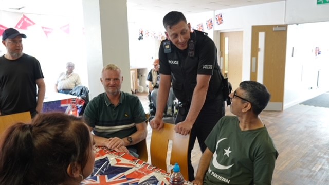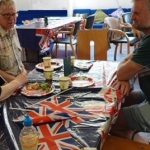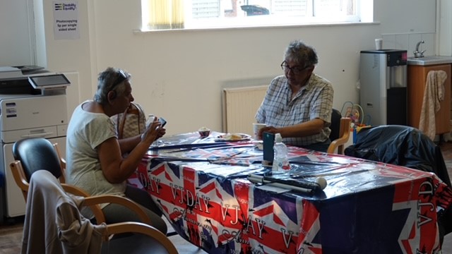 Lunchtime discussions. Bharti and Shuresh, sitting at a table covered in a dark blue tablecloth printed with Union Jack flags and the text ‘VJ Day’. Photo credit Keith Dagger.