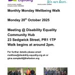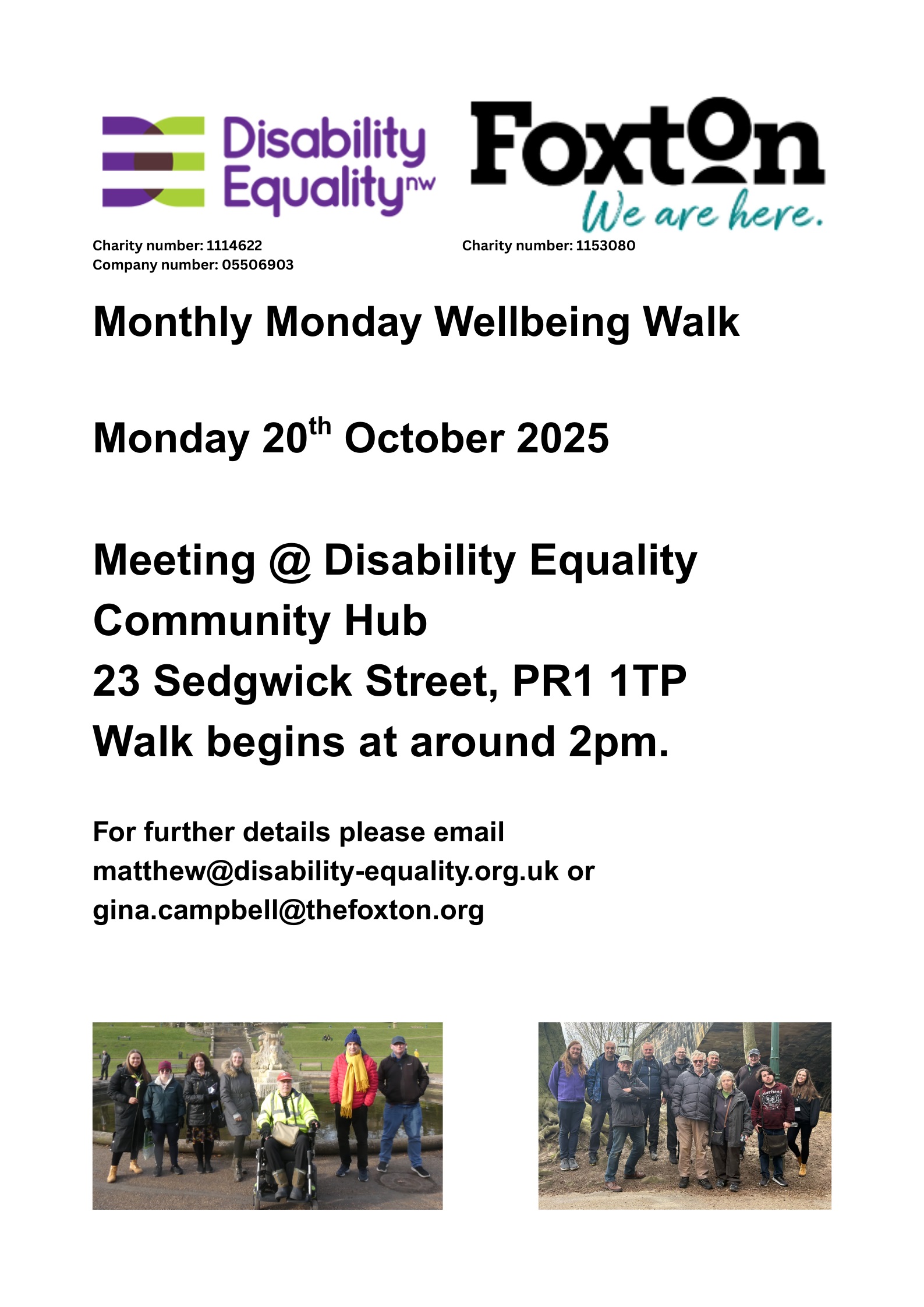 Monday 20th 2 – 3.30pm | Monthly Monday Wellbeing Walk | Meet at DENW Community Hub 2pm | gina.campbell@thefoxton.org |