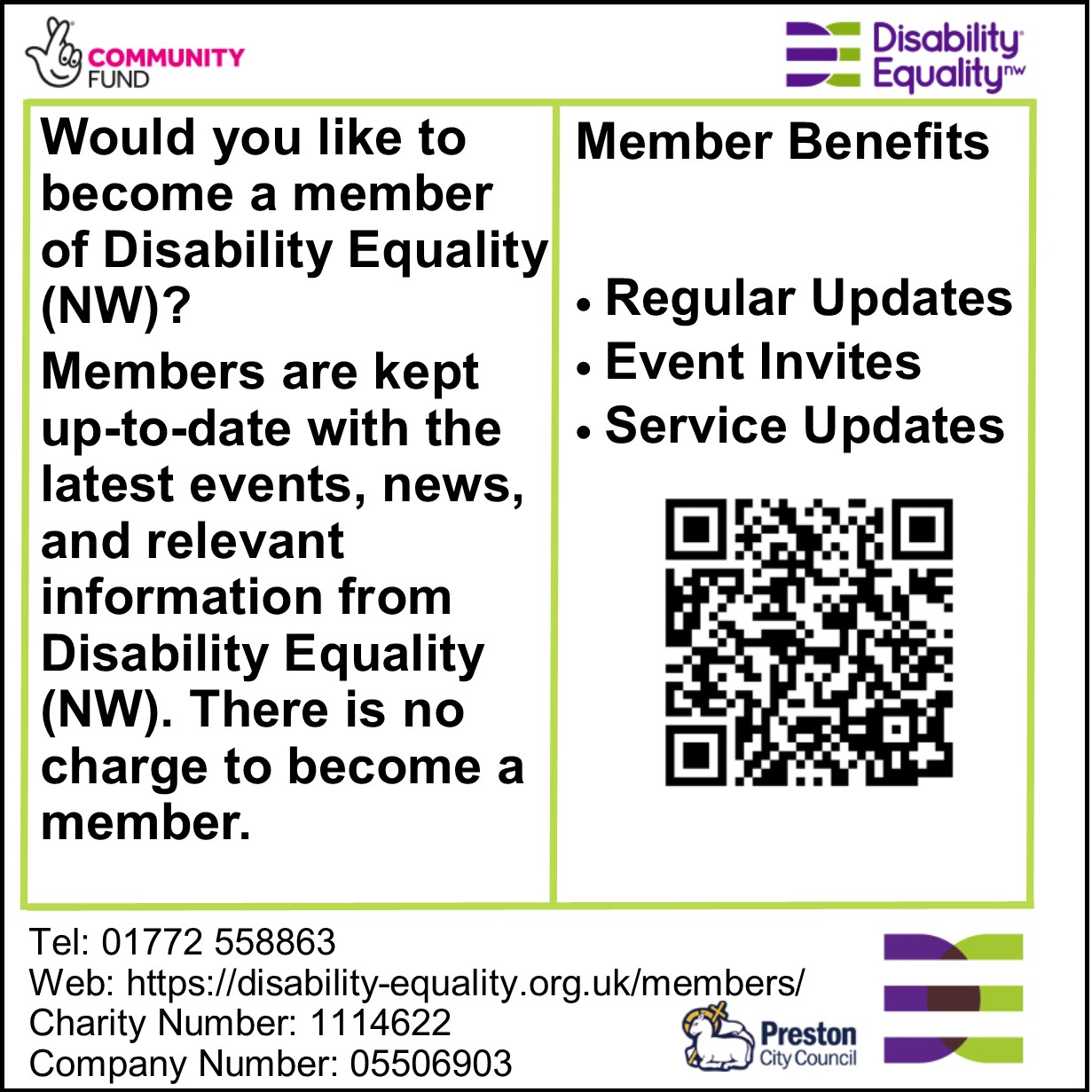 To join the Membership List, please visit https://disability-equality.org.uk/members/ or scan the QR code on the next page of this bulletin, to provide your preferred contact details. Alternatively, email heather@disability-equality.org.uk with the subject line “Disability Equality NW Membership”.