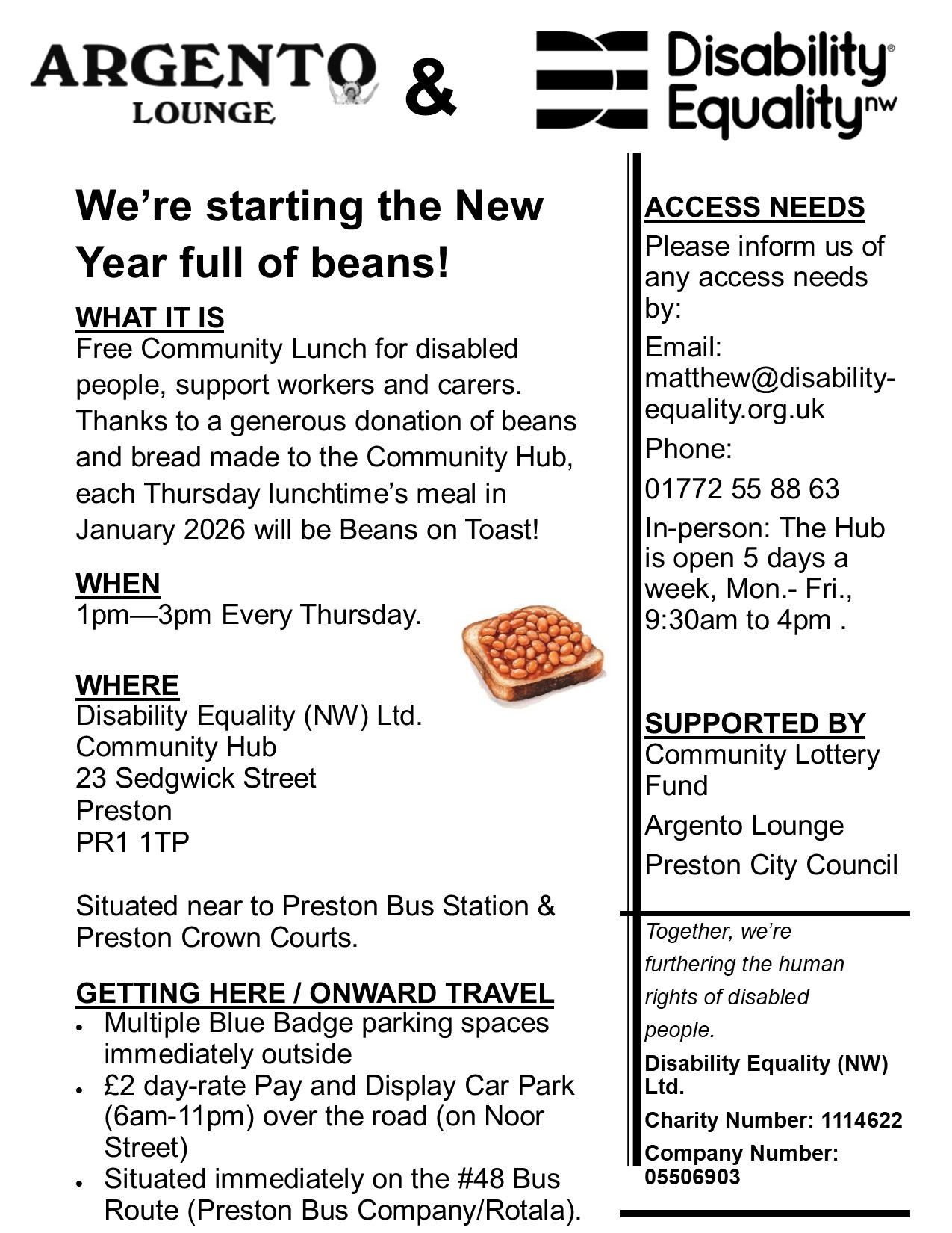 Our free Community Lunch Club resumes in the New Year with Beans on Toast served every Thursday in January, starting 8th Jan 2026, thanks to a generous food donation to the Community Hub from Argento Lounge. It’s specially for disabled people, support workers and carers!