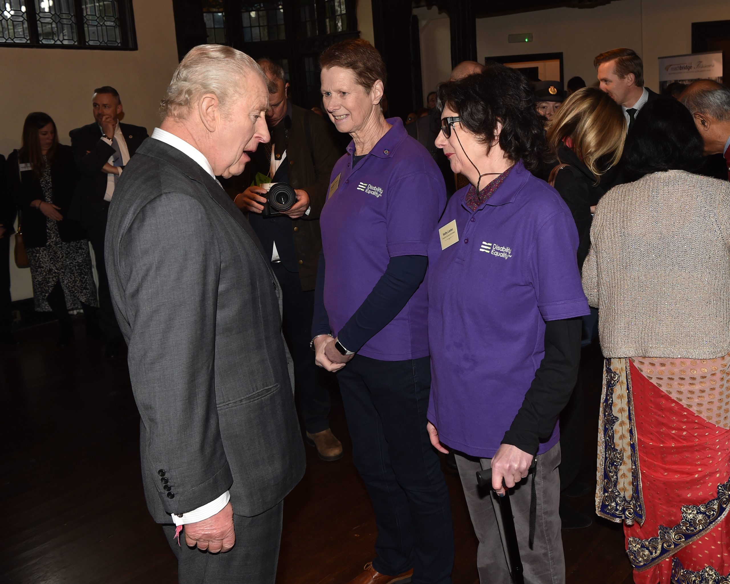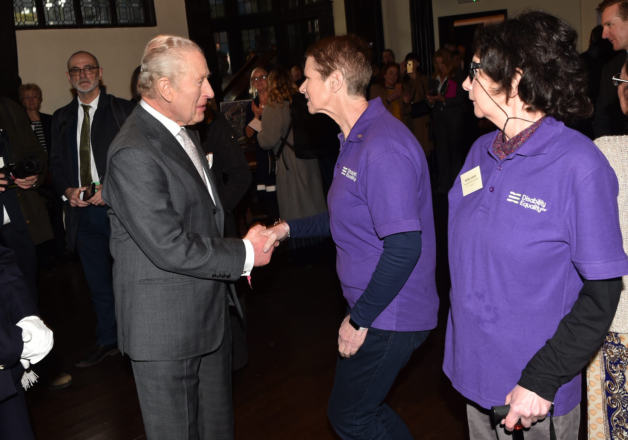 Mel Close shaking hands with the King, Mel is wearing the DENW purple branded tshirt alongside Kathy Lester – Denw Chairperson.