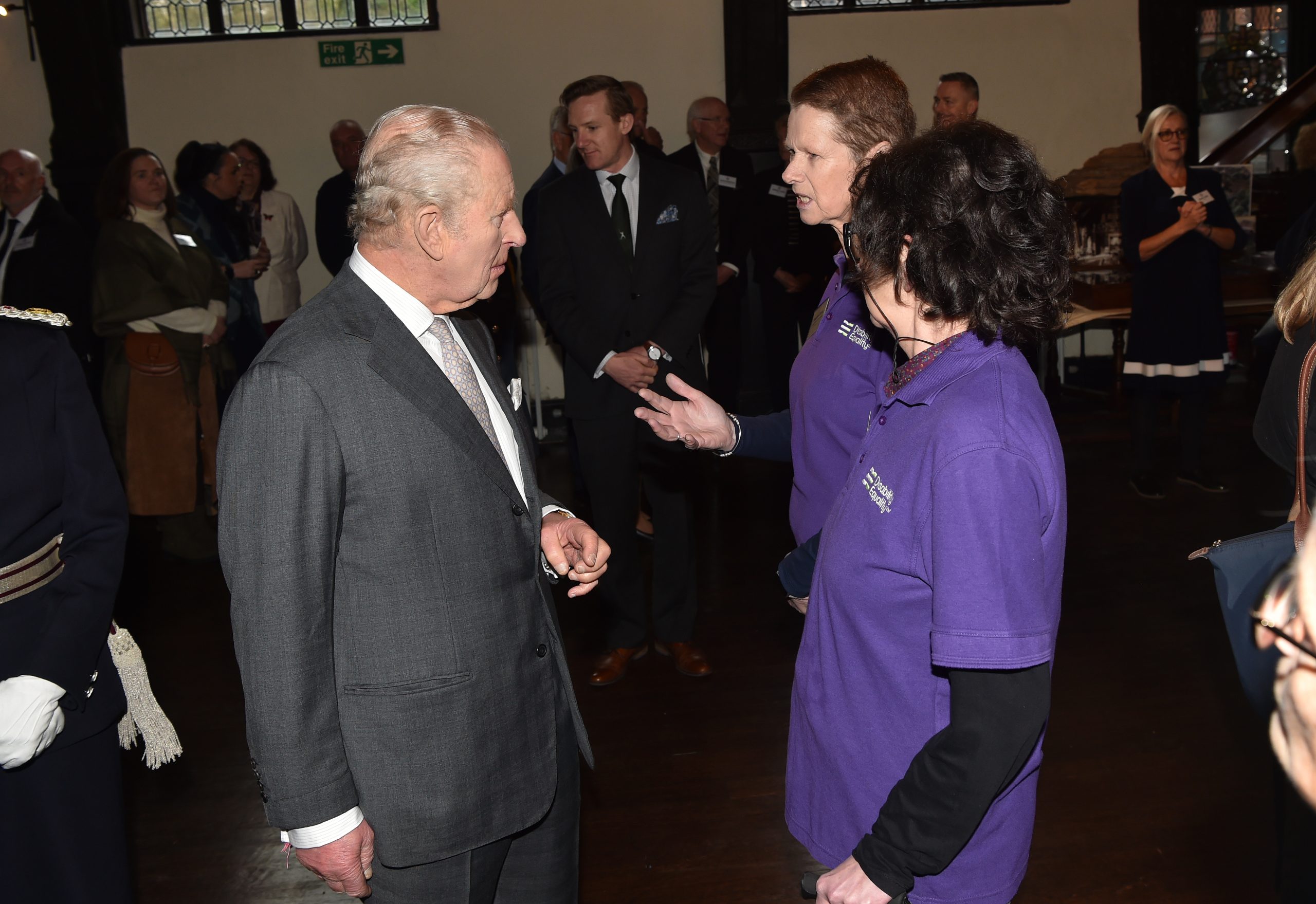 - Wideshot of King Charles chatting to a group of people