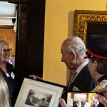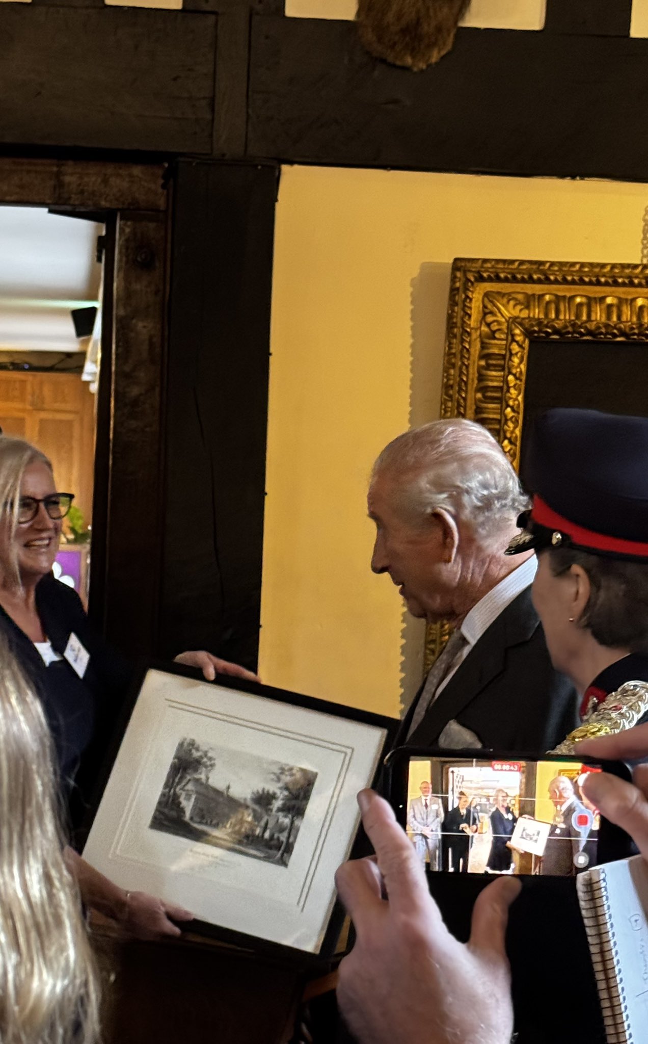 - Long shot of King Charles being handed a painting from the team at Samlesbury Hall