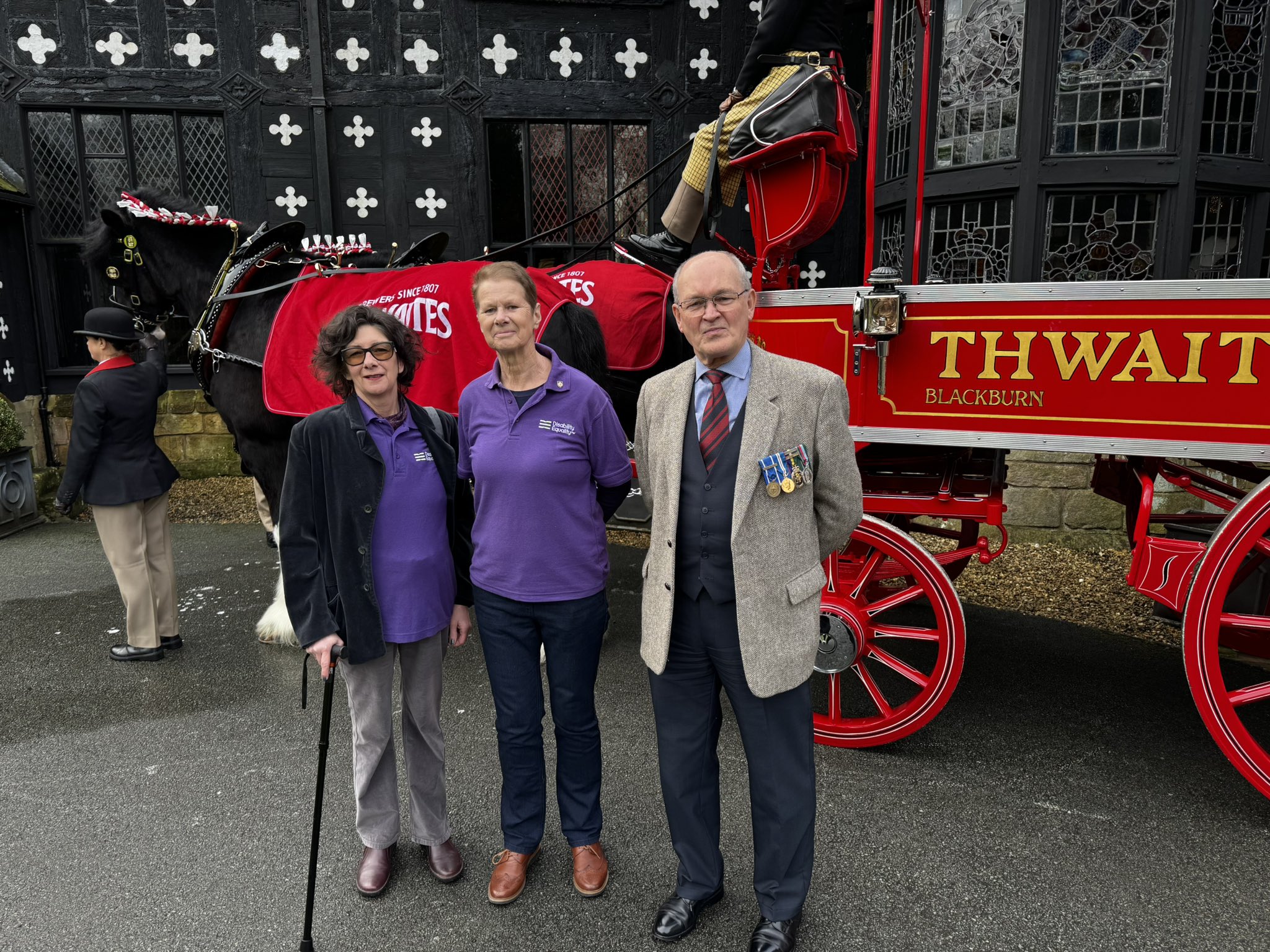 L-R: Kathy Lester – Denw Chairperson, Mel Close DENW CEO, Mel and Cathy are wearing the DENW purple branded tshirt, they are all stood in front of a traditional horse drawn carriage from Thwaites brewery, with horse partly in shot