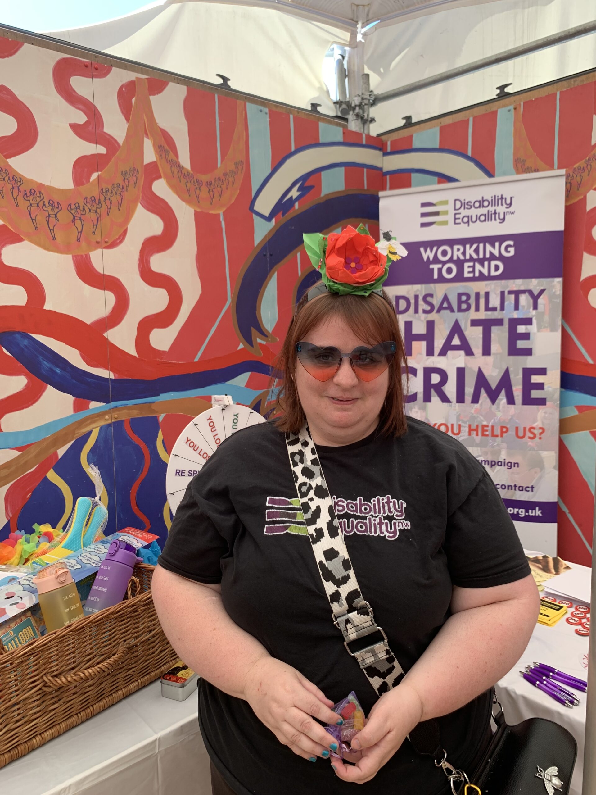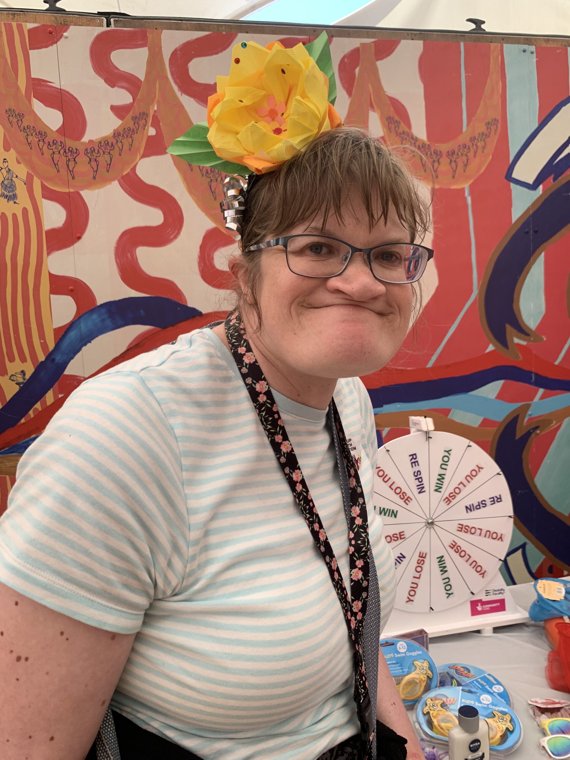 - Stacey DENW volunteer wearing sunglasses that she won on sun the wheel and the oragami headress she created herself on the craft session