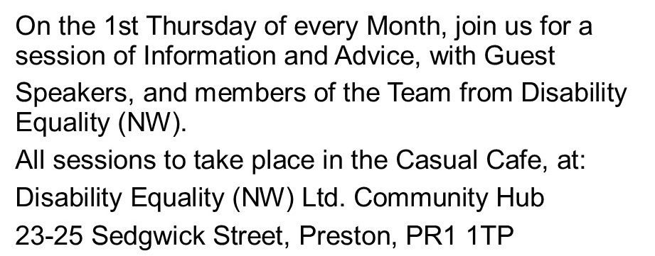 Our next Advice Café is the first Thursday in February – Thursday 5th February 2026 – from 1pm until 3pm, in the Casual Cafe, within the Community Hub, Disability Equality (NW) Ltd., 23-25 Sedgwick Street, Preston, PR1 1TP.