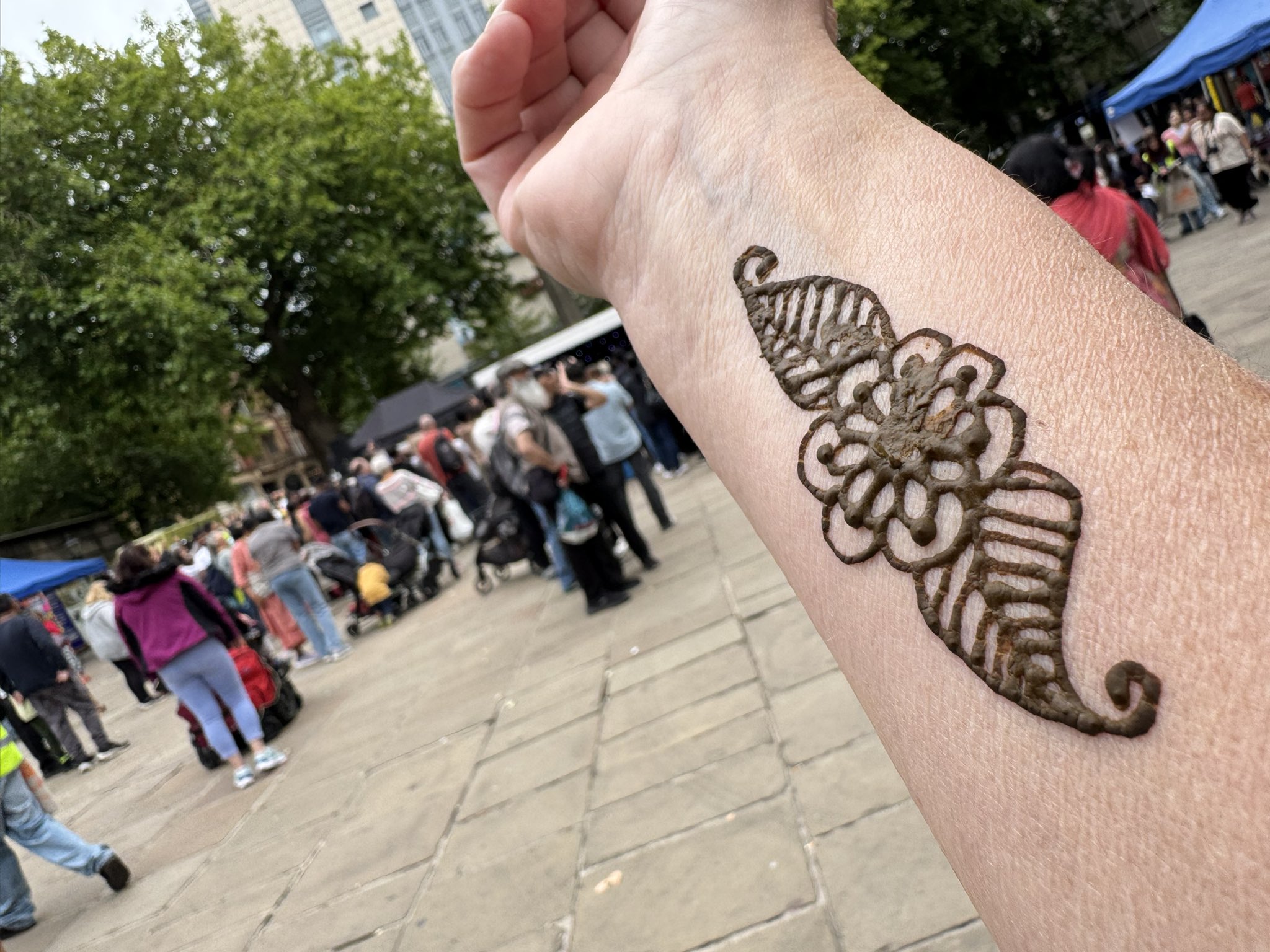 - Photo of a flower patterned of a mendi tatoo on an arm outstretched, while a busy Preston flag market of people can be seen in the background.