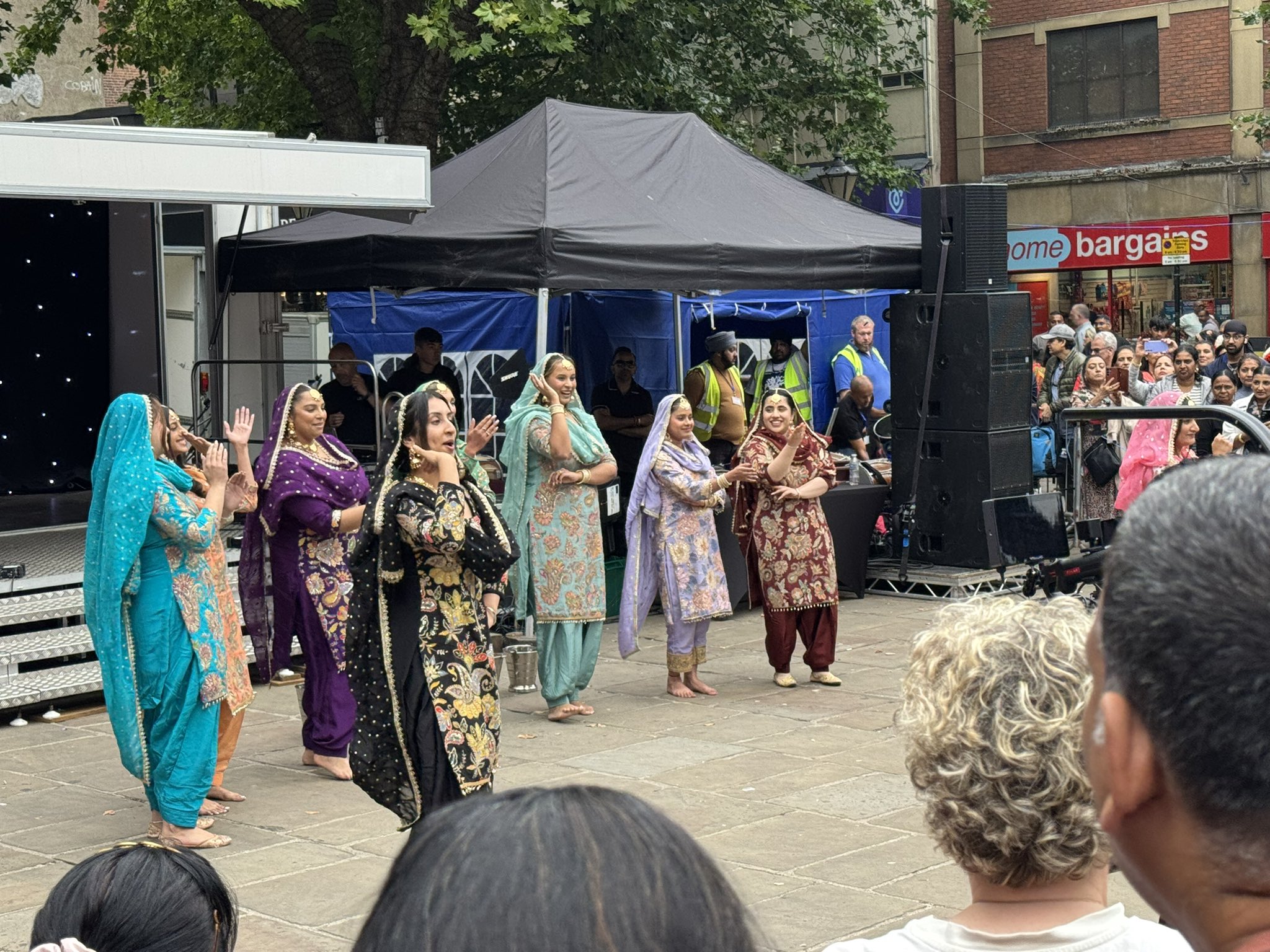 - A wide shot of a group of people dancing in brightly coloured dresses on the Flag Market.
