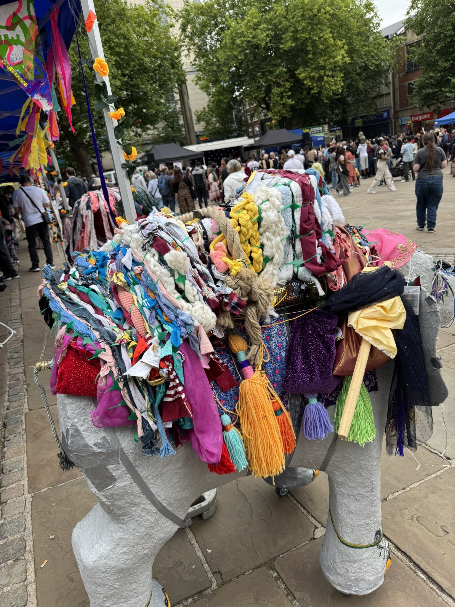 - A grey coloured fabric elephant, covered in brightly coloured tassels and materials.