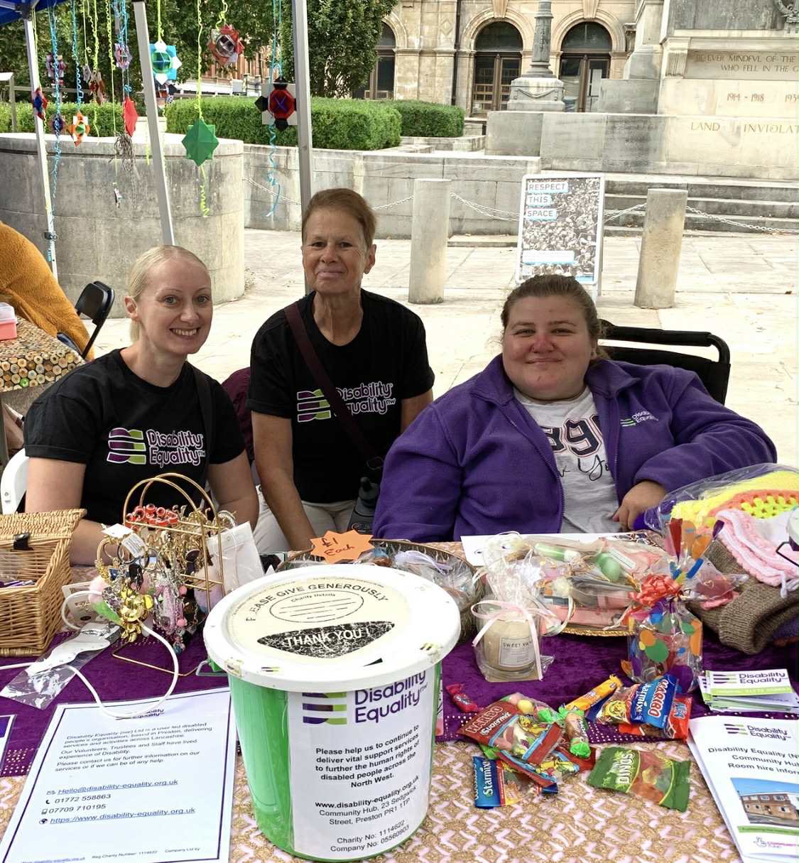 - Photo of DENW team on the stall with a range of goodies on the table in shot. All similing at the camera with fencing far in the background on the flag market.
