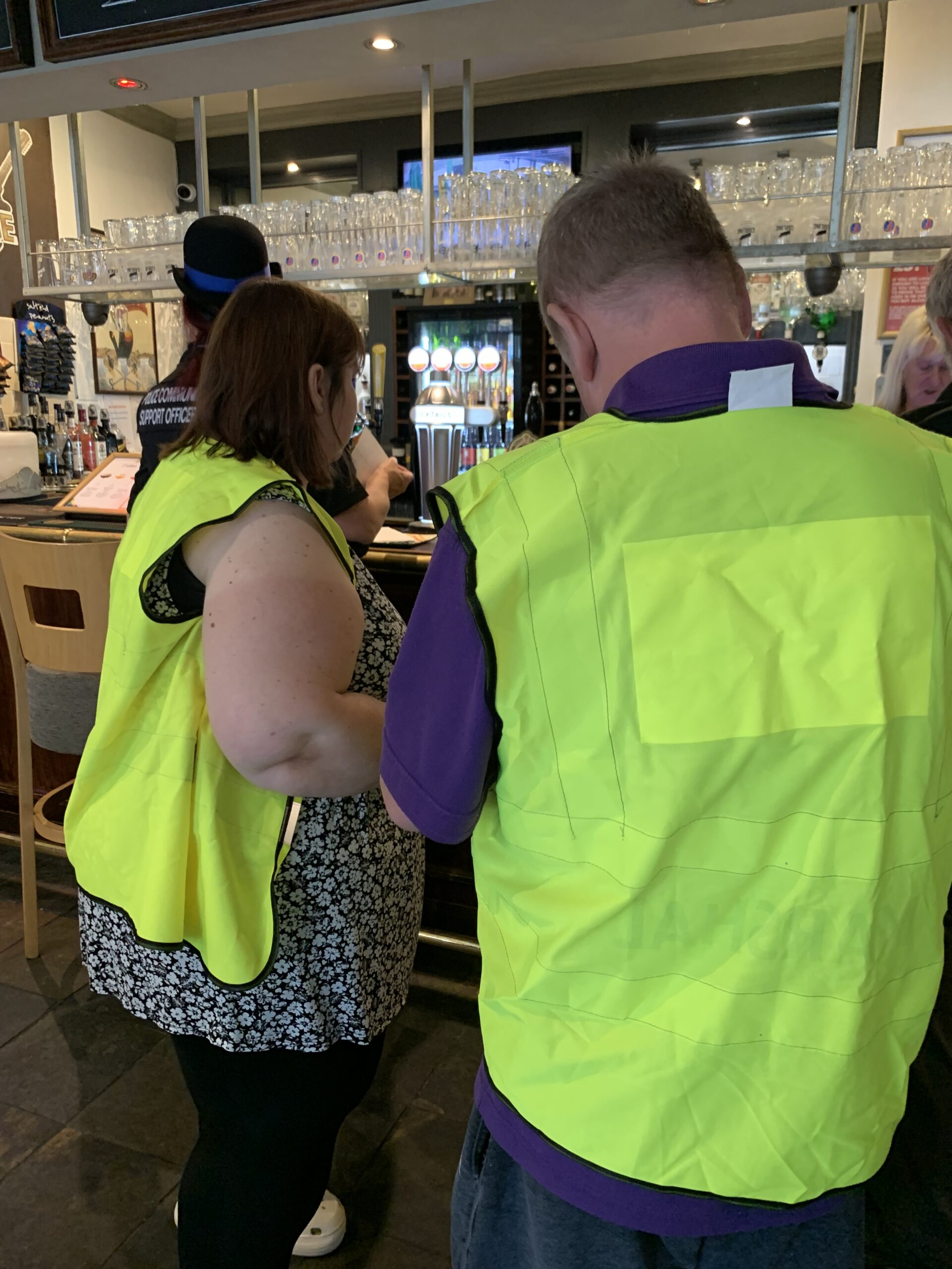 - Photo of 2 people facing away from the camera with bright yellow hihg vis jackets on