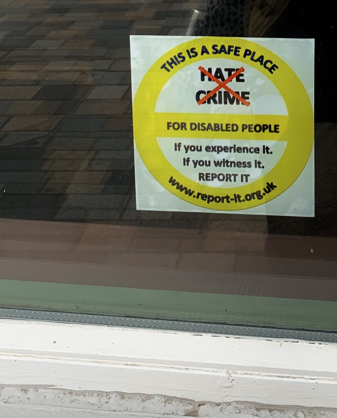 - A photo of our Hate Crime sticker in a window