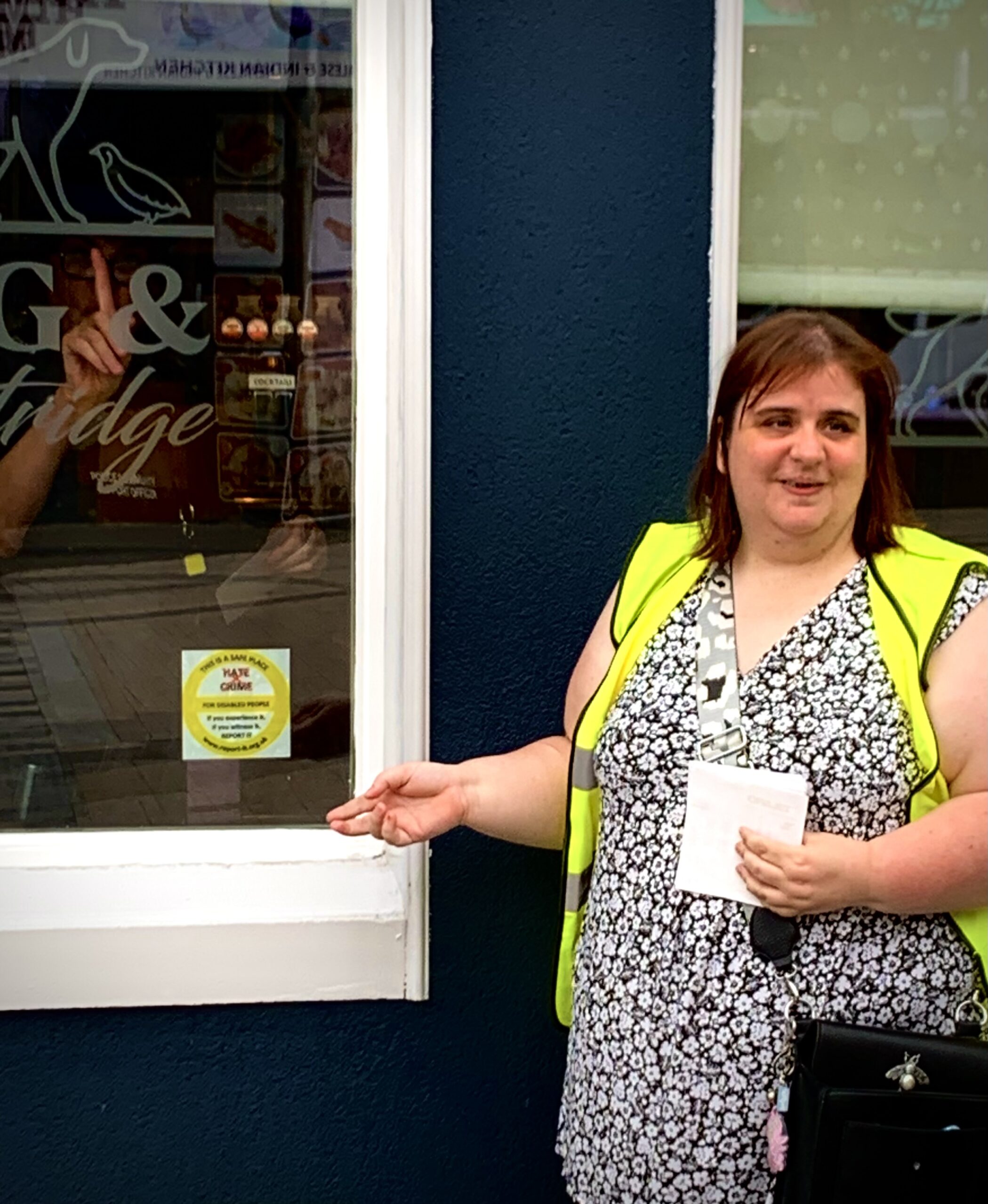 - Photo of team member outside building pointing at the newly installed hate crime stickers