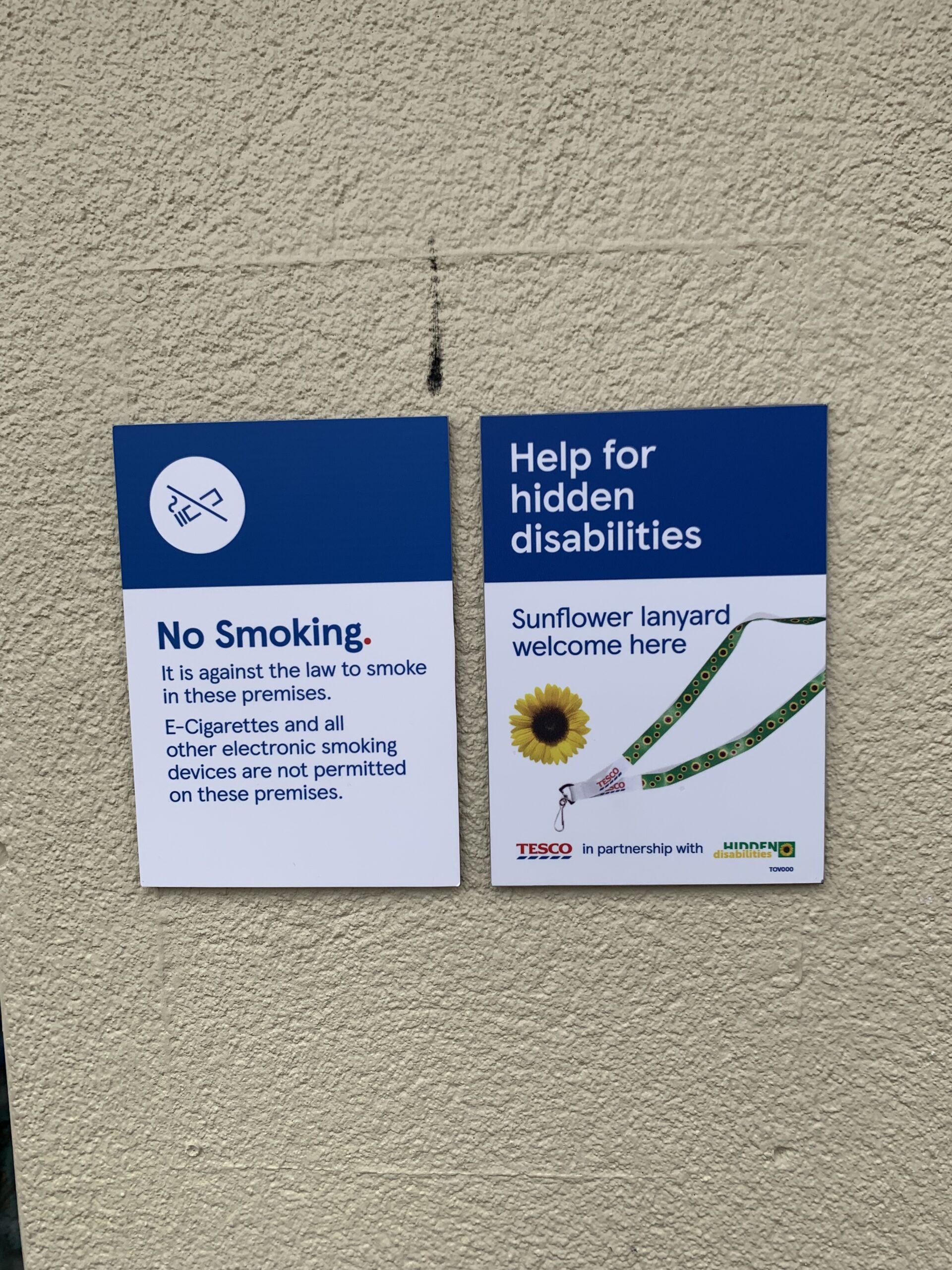 - Photo of wall signs stating no smoking and a second promoting help for hidden disablilities