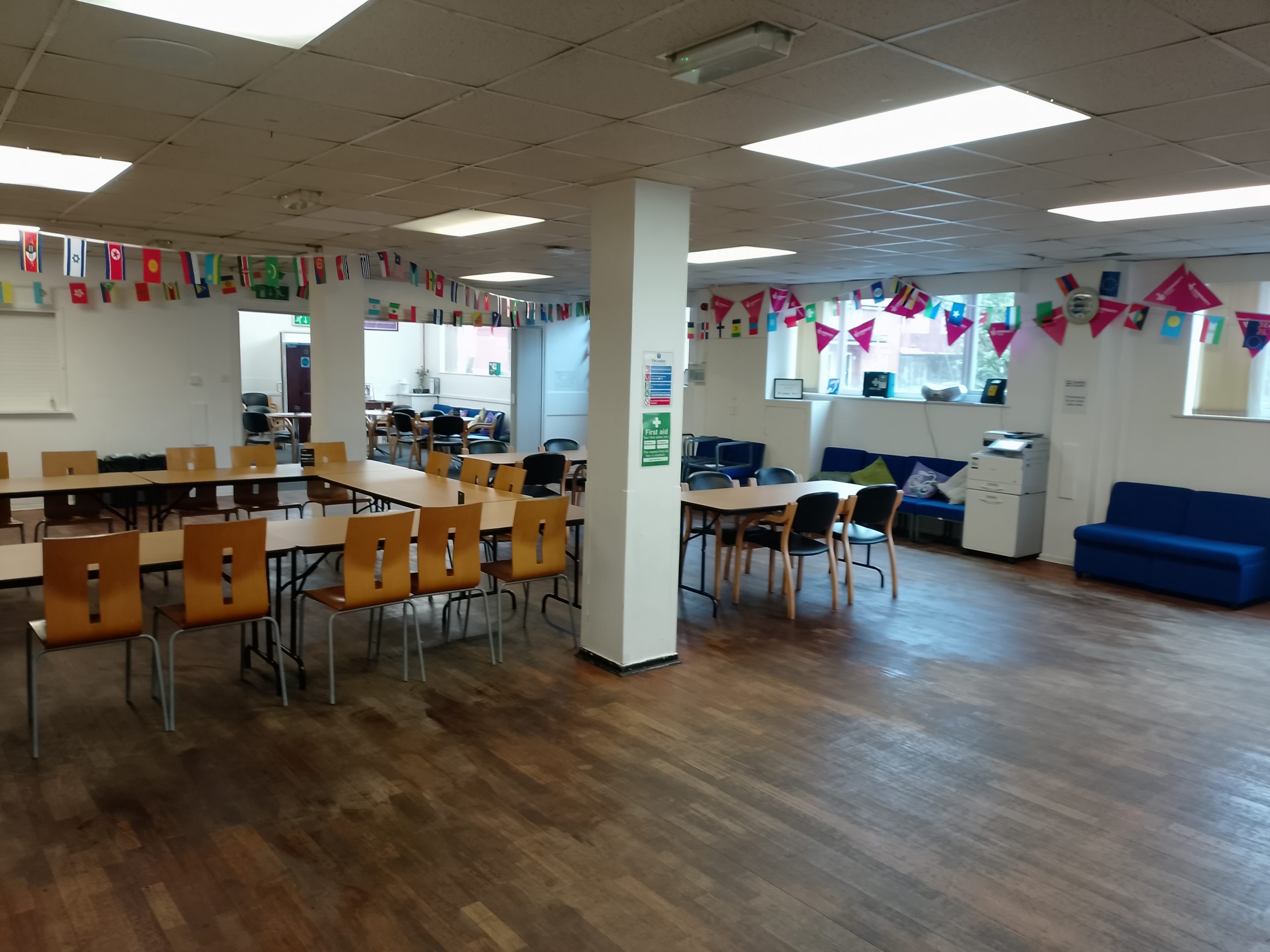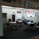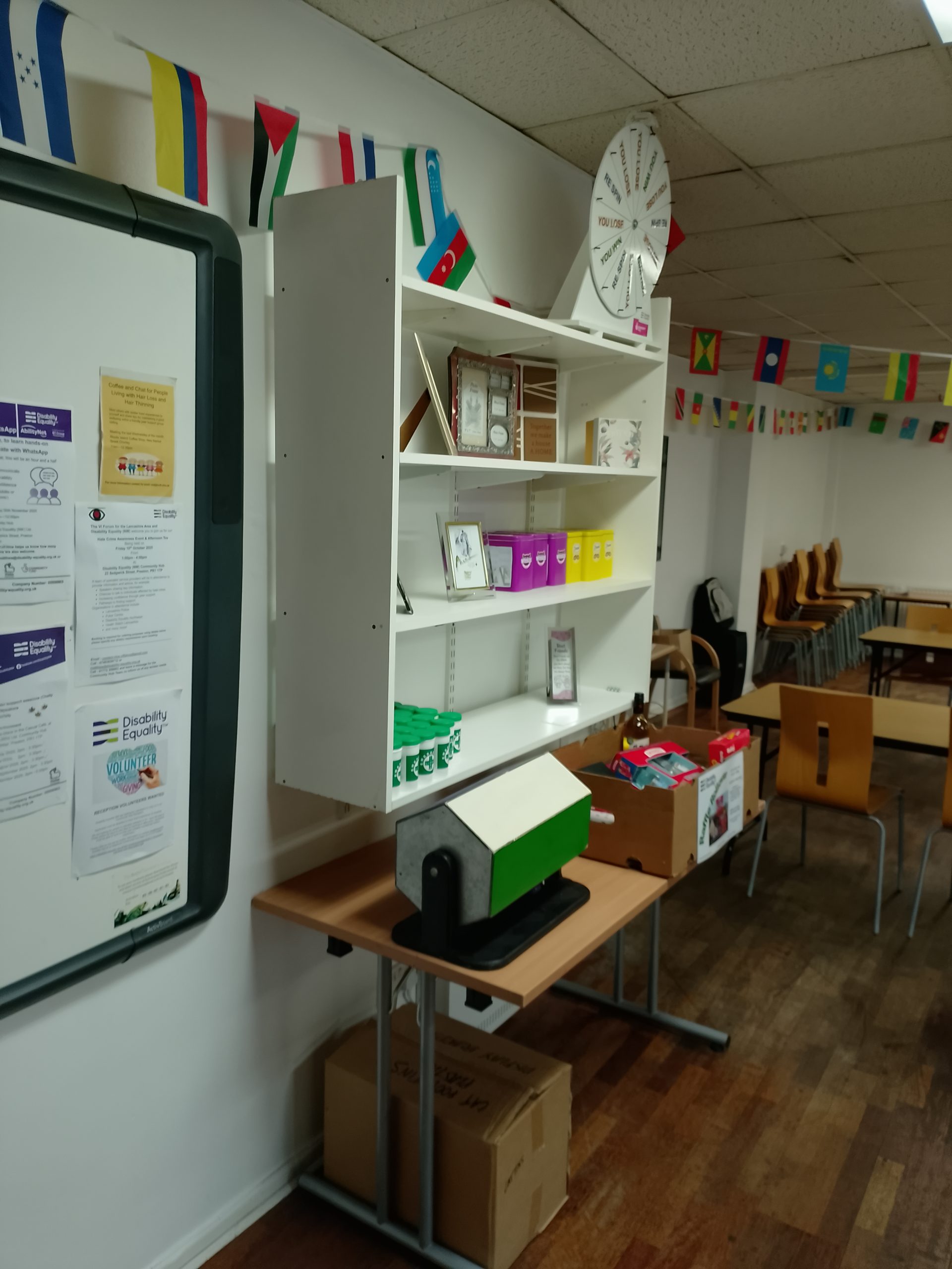 Once through the double doors into the main hall (Lesley Finley Room), you’ll discover our vibrant noticeboard filled with upcoming events and activities, alongside our welcoming pop-up shop stocked with gifts, accessibility equipment and exciting raffle prizes.