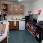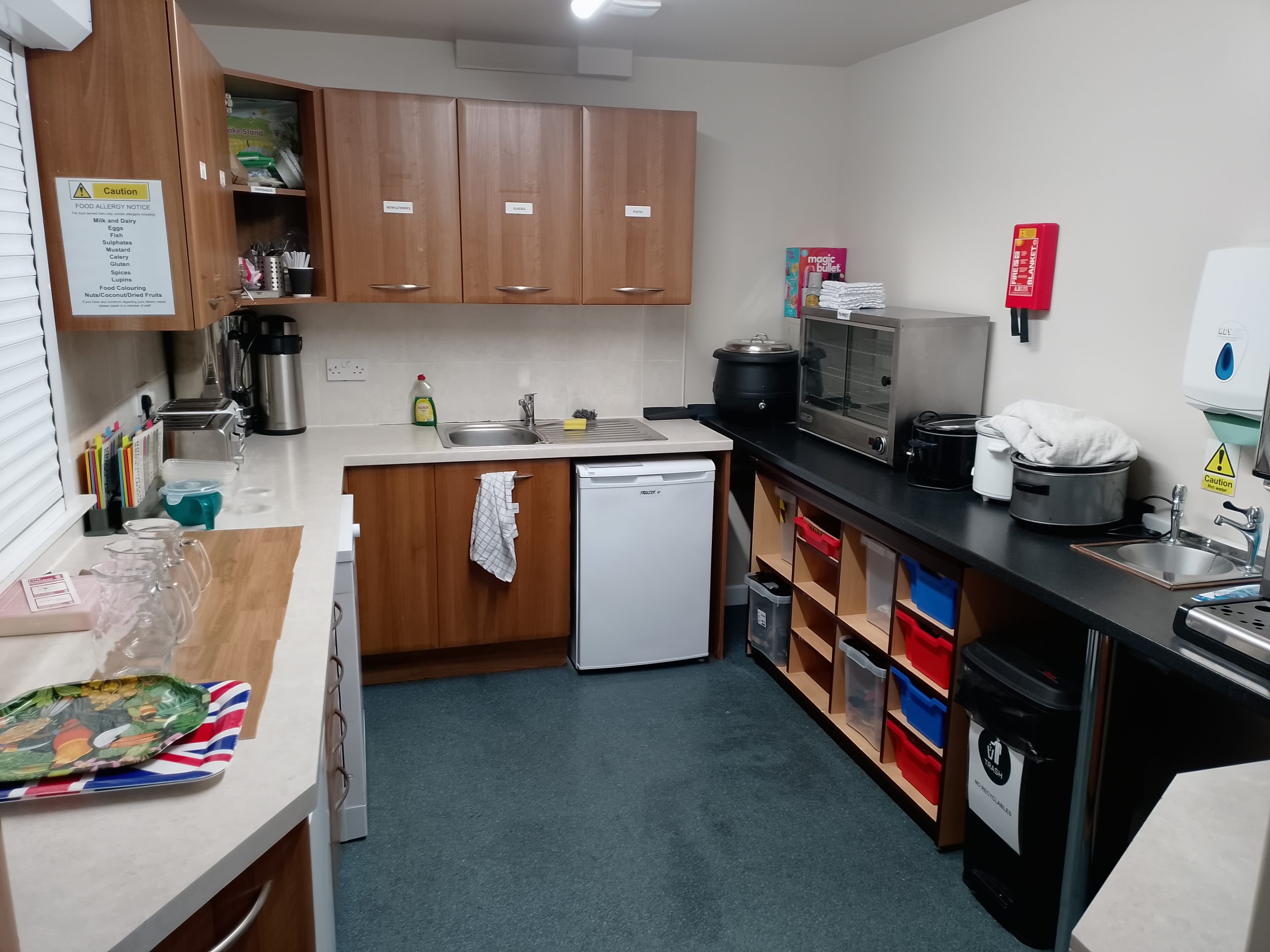 Kitchen consists of sink and drainer for utensils and equipment washing. A dishwasher, freezer and fridge. We have a pie/food heater, slow cookers and soup tureen as well as hot water dispenser and kettles. Extra worktop fitted with a separate sink for hand washing and we have installed lockable rollers for the serving hatches.