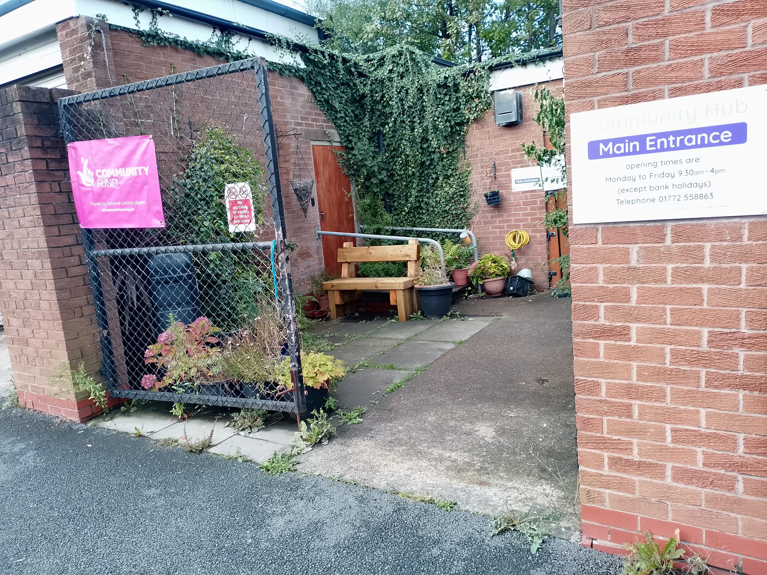 Through the gated entrance, you’ll find our yard/garden (“yarden”) — a real suntrap in the summertime and the perfect place to relax and enjoy the fresh air. Take a seat on our new bench, kindly crafted by Dig In Preston (a community of Blue Light and Military personnel) and unwind with a cup of tea, of course.